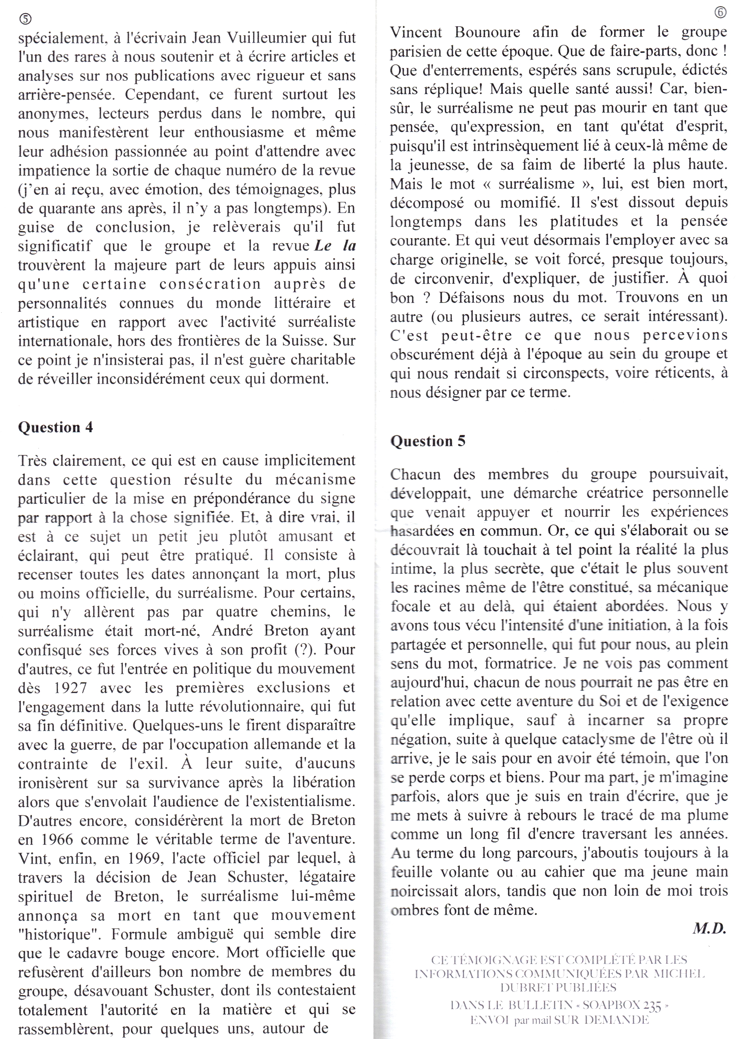 Al final, Sebbag vuelve a la muerte de Carlos el Simple, verdadero y misterioso origen del surrealismo, que lo hace encarnar "el movimiento perpetuo del sueño, de la revuelta y de la imaginación". Visto así, un primer período del surrealismo es el que va de 929 a 1918, con, por ejemplo, los nombres que se dan cita en las cartas del juego de Marsella (a los que, sin duda, se pueden añadir muchos más), un segundo período iría de 1918 a 1968, cuando se produce la ruptura en el grupo de París tras la muerte de André Breton, y un tercero de 1968 al presente, enumerando Sebbag las innumerables revistas que han seguido apareciendo, en una intervención de grupos ya menos estruendosos (un surrealismo "à bas bruit"). A su juicio, las actividades que más se han prodigado en este largo período son el collage, los juegos, los relatos de sueños y la deambulación en y fuera de la ciudad.